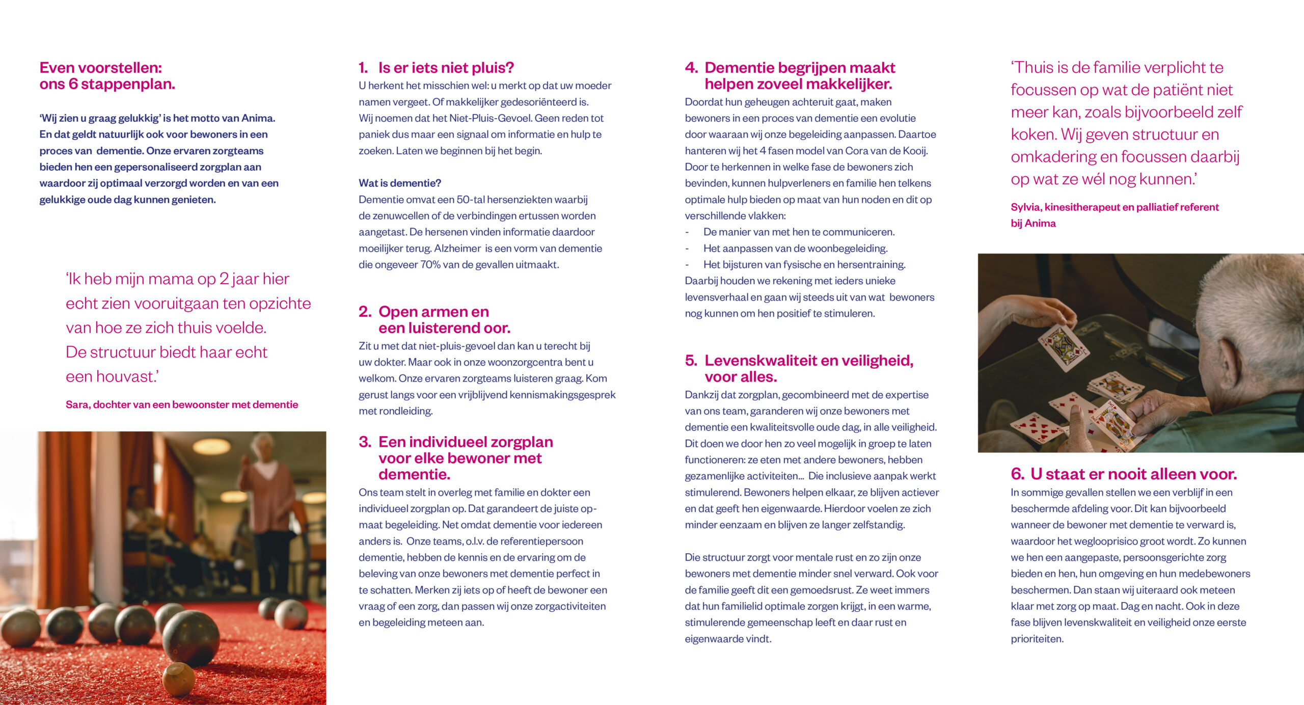‘Wij zien u graag gelukkig’ is het motto van Anima. En dat gaat natuurlijk op voor al onze bewoners, ook voor zij met dementie. Onze ervaren zorgteams bieden elke bewoner een gepersonaliseerd zorgplan aan waardoor de bewoners in onze woonzorgcentra optimaal verzorgd worden en er van een volwaardige en gelukkige oude dag kunnen genieten.